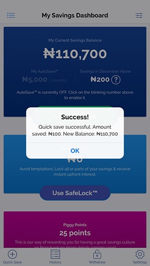 "When I opened piggyvest, I didn't even know I could successfully save 1k weekly, but I went from saving 1k weekly to saving 2k daily and the quicksave function also helped me and in less than 3months I was able to achieve my long pending goal, I...read more"Posted on Wednesday, 6th of May 2020 by 20:56 PM